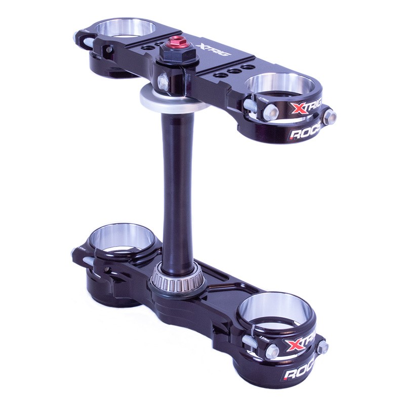 Black X-TRIG Rocs Pro triple clamps kit machined from solid and red anodized, made of high quality ergal for original WP forks, compatible with models: